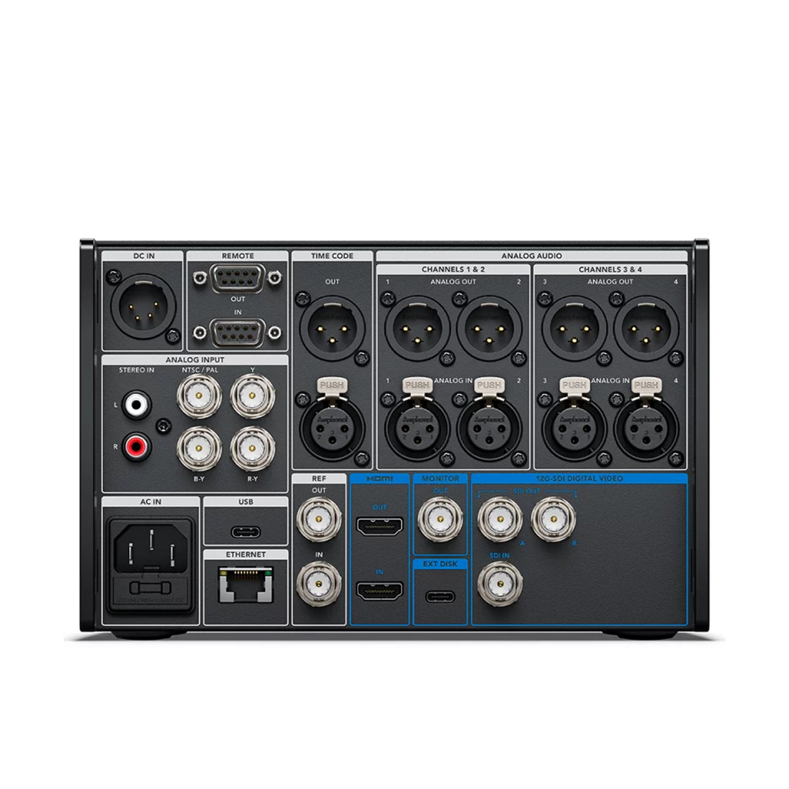 Analoge Audioeingänge: 4 Kanäle für professionelles symmetrisches Analogaudio über XLR-Anschlüsse und 2 Kanäle für unsymmetrisches Consumer-Audio über RCA-Anschlüsse